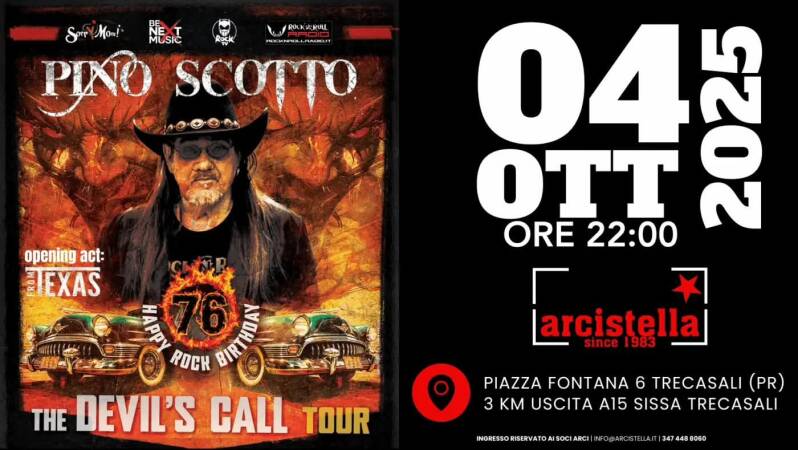 Sabato 4 ottobre 2025, alle ore 22:00, il leggendario Pino Scotto sarà protagonista di una serata imperdibile all'Arcistella, situata in Piazza Fontana 6 a Trecasali (PR). Per celebrare il suo 76° Happy Rock Birthday, Pino Scotto torna sul palco con “The Devil’s Call Tour”, promettendo un evento che risuonerà di pura energia, chitarre distorte e rock senza compromessi.